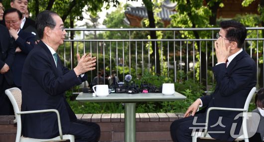 (서울=뉴스1) 김민지 기자 = 김문수 국민의힘 대통령 후보와 한덕수 무소속 대선 예비후보가 8일 서울 국회 사랑재에 위치한 커피숍에서 후보 단일화 관련 회동을 하고 있다. 2025.5.8/뉴스1
