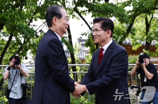 (서울=뉴스1) 김민지 기자 = 김문수 국민의힘 대통령 후보와 한덕수 무소속 대선 예비후보가 8일 서울 국회 사랑재에 위치한 커피숍에서 후보 단일화 관련 회동을 하고 있다. 2025.5.8/뉴스1