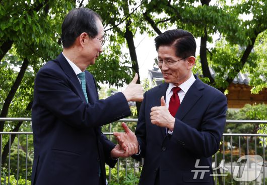 (서울=뉴스1) 김민지 기자 = 김문수 국민의힘 대통령 후보와 한덕수 무소속 대선 예비후보가 8일 서울 국회 사랑재에 위치한 커피숍에서 후보 단일화 관련 회동을 하고 있다. 2025.5.8/뉴스1