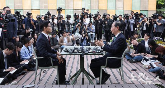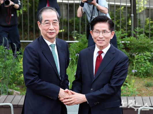 국민의힘 김문수 대선후보와 무소속 한덕수 대선 예비후보가 8일 국회 사랑재에서 후보 단일화와 관련해 2차 회동하고 있다. 한 후보는 "단일화는 국민의 명령"이라며 "김 후보가 4월 19일부터 5월 6일까지 18일 동안 22번이나 '한덕수 후보와 단일화하겠다'고 말했다. 김 후보는 "저는 단일화를 늘 생각하고, 지금도 생각하고, 한 번도 단일화를 안 한다고 한 적이 없다"고 말했다. 이어 "(한 후보께서) 5월 11일까지 단일화가 안 되면 후보 등록을 안 하겠다고 했는데 그래서 저는 상당히 놀라기도 했다"고 말했다.