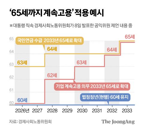 65세 법정 정년 연장 대신 기업에게 계속고용의무를 부여하자는 경제사회노동위원회 공익위원 제언이 나왔다. 청년 고용 악화를 고려해 대기업과 공공기관의 경우 신규채용에 심각한 악영향이 있을 시 관계사로의 전적도 계속고용으로 본다는 특례도 제안했다.