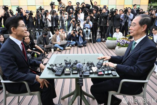 [서울=뉴스핌] 최지환 기자 =김문수 국민의힘 대선후보와 한덕수 무소속 예비후보가 8일 오후 여의도 국회 사랑재에서 단일화 관련 회동을 하고 있다. 2025.05.08 choipix16@newspim.com