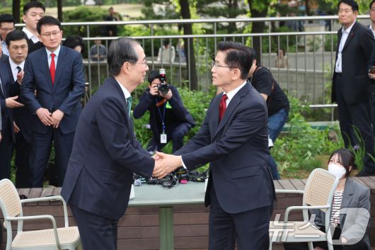 (서울=뉴스1) 안은나 기자 = 김문수 국민의힘 대통령 후보와 한덕수 무소속 대선 예비후보가 8일 오후 서울 여의도 국회 강변서재에서 '후보 단일화' 회동을 마친 뒤 악수를 나누고 있다.(공동취재) 2025.5.8/뉴스1 Copyright ⓒ 뉴스1. All rights reserved. 무단 전재 및 재배포, AI학습 이용 금지.