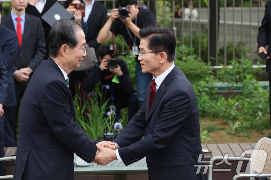 (서울=뉴스1) 안은나 기자 = 김문수 국민의힘 대통령 후보와 한덕수 무소속 대선 예비후보가 8일 오후 서울 여의도 국회 강변서재에서 '후보 단일화' 회동을 마친 뒤 악수를 나누고 있다.(공동취재) 2025.5.8/뉴스1