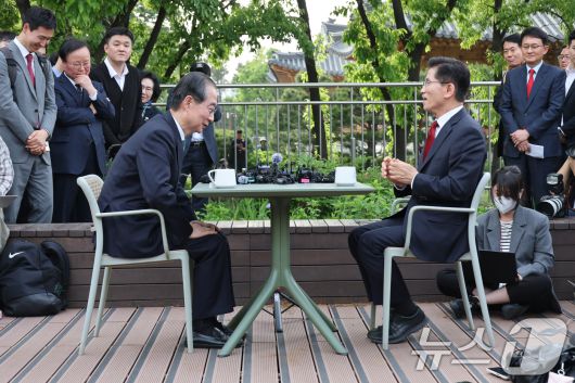 (서울=뉴스1) 안은나 기자 = 김문수 국민의힘 대통령 후보와 한덕수 무소속 대선 예비후보가 8일 오후 서울 여의도 국회 강변서재에서 '후보 단일화' 회동을 하고 있다. 2025.5.8/뉴스1coinlocker@news1.krCopyright ⓒ 뉴스1. All rights reserved. 무단 전재 및 재배포, AI학습 이용 금지.