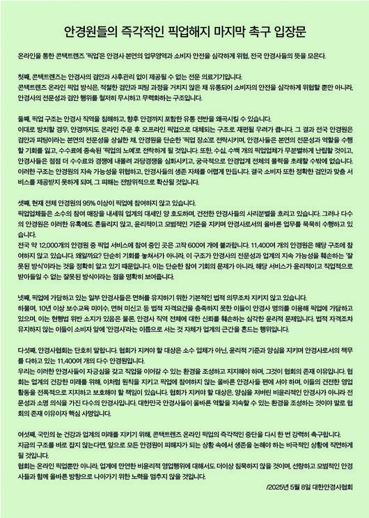 끝으로 "여섯째, 국민의 눈 건강과 업계의 미래를 지키기 위해 콘택트렌즈 온라인 픽업의 즉각적인 중단을 다시 한 번 강력히 촉구한다. 지금의 구조를 바로 잡지 않는다면 앞으로 모든 안경원이 피해자가 되는 상황 속에서 생존을 논해야 하는 비극적인 상황에 직면하게 될 것이다"며 "협회는 온라인 픽업뿐만 아니라 업계에 만연한 비윤리적 영업행위에 대해서도 더이상 침묵하지 않을 것이며, 선량하고 모범적인 안경사들과 함께 올바른 방향으로 나아가기 위한 노력을 멈추지 않을 것"이라고 끝을 맺었다.