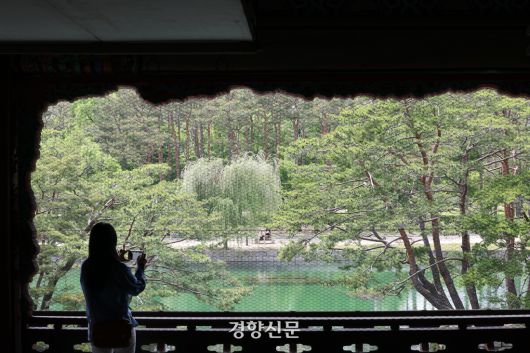 경복궁 경회루 특별관람이 시작된 8일 한 관람객이 2층 누각에 올라 사진을 찍고 있다. 2025.5.8. 정지윤 선임기자 |