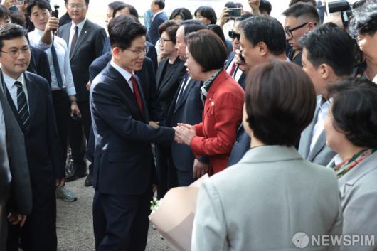 [서울=뉴스핌] 최지환 기자 = 김문수 국민의힘 대선 후보가 8일 오후 서울 여의도 국회 강변서재에서 열린 한덕수 무소속 대선 예비후보와 단일화 관련 회동에 참석하며 국민의힘 의원들과 인사하고 있다. 2025.05.08 choipix16@newspim.com