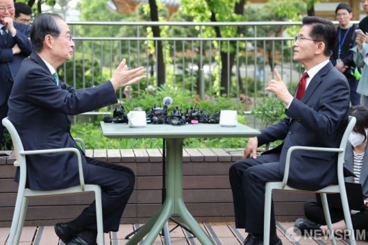 [서울=뉴스핌] 최지환 기자 = 김문수 국민의힘 대통령 후보와 한덕수 무소속 대선 예비후보가 8일 서울 여의도 국회 강변서재에서 후보 단일화 관련 공개 회동을 하고 있다. 2025.5.8 2025.05.08 choipix16@newspim.com