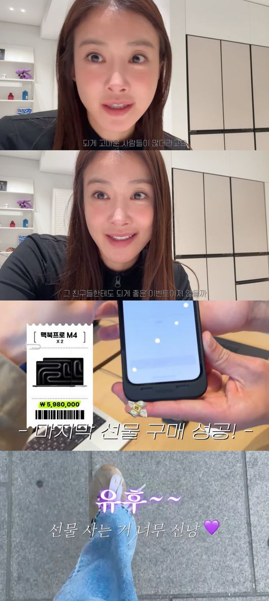 실제 그는 백화점을 돌며 상품권부터 명품 가방, 고가의 노트북 등을 구매했다. 총 쇼핑 금액이 약 1600만 원에 달해 놀라움을 더했다. 그럼에도 이시영은 "내가 몇 배는 더 행복해지는 뜻깊고 감사한 시간이었다"라고 덧붙였다.