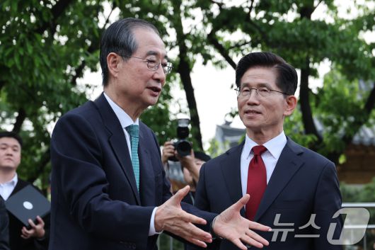(서울=뉴스1) 안은나 기자 = 김문수 국민의힘 대통령 후보와 한덕수 무소속 대선 예비후보가 8일 오후 서울 여의도 국회 강변서재에서 후보 단일화 관련 공개 회동을 마친 후 인사하고 있다. 2025.5.8/뉴스1coinlocker@news1.krCopyright ⓒ 뉴스1. All rights reserved. 무단 전재 및 재배포, AI학습 이용 금지.