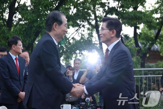 (서울=뉴스1) 안은나 기자 = 김문수 국민의힘 대통령 후보와 한덕수 무소속 대선 예비후보가 8일 오후 서울 여의도 국회 강변서재에서 후보 단일화 관련 공개 회동을 마친 후 인사하고 있다. 2025.5.8/뉴스1