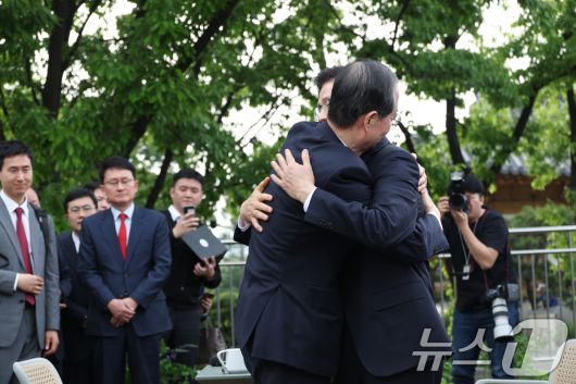 (서울=뉴스1) 안은나 기자 = 김문수 국민의힘 대통령 후보와 한덕수 무소속 대선 예비후보가 8일 오후 서울 여의도 국회 강변서재에서 후보 단일화 관련 공개 회동을 마친 후 포옹하고 있다, 2025.5.8/뉴스1coinlocker@news1.krCopyright ⓒ 뉴스1. All rights reserved. 무단 전재 및 재배포, AI학습 이용 금지.