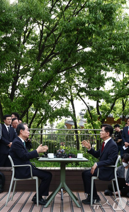(서울=뉴스1) 김민지 기자 = 김문수 국민의힘 대통령 후보(오른쪽)와 한덕수 무소속 대선 예비후보가 8일 서울 국회 사랑재에 위치한 커피숍에서 후보 단일화 관련 회동을 하고 있다. 2025.5.8/뉴스1