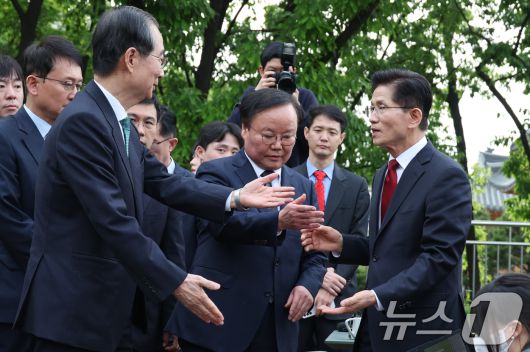 (서울=뉴스1) 안은나 기자 = 김문수 국민의힘 대통령 후보와 한덕수 무소속 대선 예비후보가 8일 오후 서울 여의도 국회 강변서재에서 '후보 단일화' 회동을 마친 후 백브리핑을 서로 먼저 할 것을 권하고 있다. 2025.5.8/뉴스1coinlocker@news1.krCopyright ⓒ 뉴스1. All rights reserved. 무단 전재 및 재배포, AI학습 이용 금지.