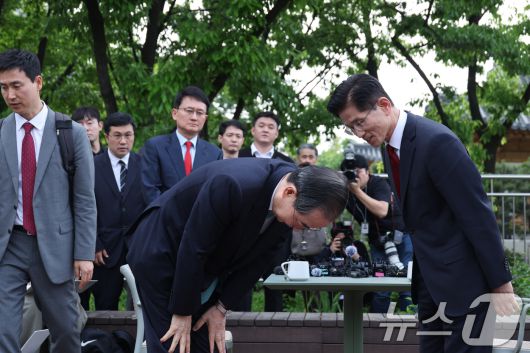 (서울=뉴스1) 안은나 기자 = 김문수 국민의힘 대통령 후보와 한덕수 무소속 대선 예비후보가 8일 오후 서울 여의도 국회 강변서재에서 '후보 단일화' 회동을 마친 뒤 참석자들을 향해 인사하고 있다. 2025.5.8/뉴스1