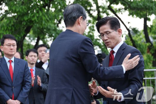 (서울=뉴스1) 안은나 기자 = 김문수 국민의힘 대통령 후보와 한덕수 무소속 대선 예비후보가 8일 오후 서울 여의도 국회 강변서재에서 후보 단일화 관련 공개 회동을 마친 후 인사하고 있다. 2025.5.8/뉴스1