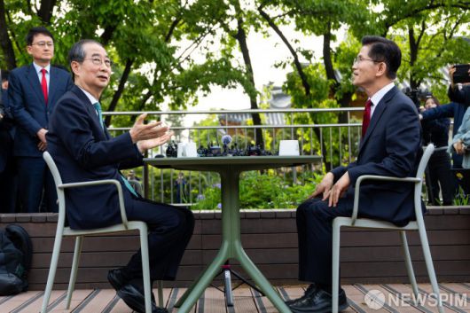 [서울=뉴스핌] 최지환 기자 = 김문수 국민의힘 대선 후보와 한덕수 예비후보가 8일 오후 국회 사랑재 카페에서 공개회동을 하고 있다. 2025.05.08 choipix16@newspim.com