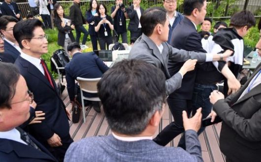 김문수 국민의힘 대선 후보가 한덕수 무소속 대선 예비후보와의 단일화를 위한 2차 회동을 하기 위해 8일 국회 사랑재로 향하던 중 한 후보의 지지자가 김 후보에게 항의하자 관계자들이 저지하고 있다. <ⓒ투자가를 위한 경제콘텐츠 플랫폼, 아시아경제(www.asiae.co.kr) 무단전재 배포금지>