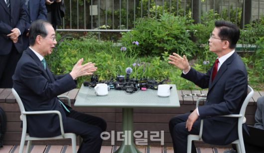 [이데일리 방인권 기자] 김문수 국민의힘 대통령 후보와 한덕수 무소속 대선 예비후보가 8일 오후 서울 여의도 국회 강변서재에서 후보 단일화 관련 논의를 하고 있다.
