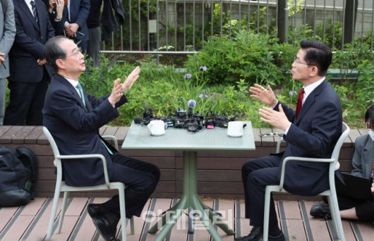 [이데일리 방인권 기자] 김문수 국민의힘 대통령 후보와 한덕수 무소속 대선 예비후보가 8일 오후 서울 여의도 국회 강변서재에서 후보 단일화 관련 논의를 하고 있다.
