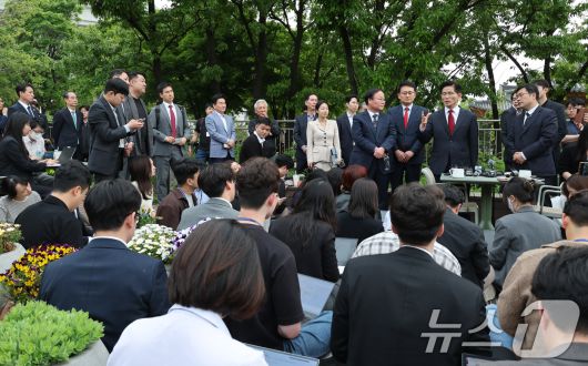 (서울=뉴스1) 안은나 기자 = 한덕수 무소속 대선 예비후보(왼쪽 두번째)가 8일 오후 서울 여의도 국회 강변서재에서 김문수 국민의힘 대통령 후보와 후보 단일화 관련 1:1 공개 회동을 마친 후 김 후보 백브리핑을 듣고 있다. 2025.5.8/뉴스1coinlocker@news1.krCopyright ⓒ 뉴스1. All rights reserved. 무단 전재 및 재배포, AI학습 이용 금지.