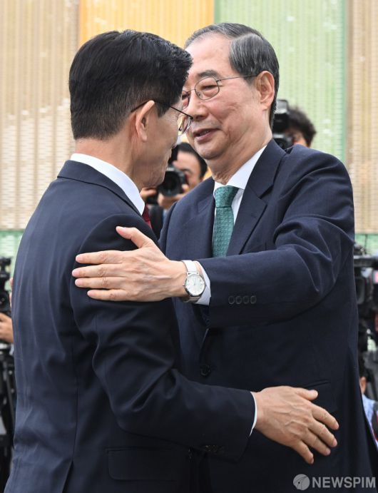 [서울=뉴스핌] 최지환 기자 = 김문수 국민의힘 대선 후보와 한덕수 무소속 대선 예비후보가 8일 국회 사랑재에서 만나 후보 단일화를 위한 2차 회동을 마친 뒤 포옹하고 있다. 2025.05.08 choipix16@newspim.com