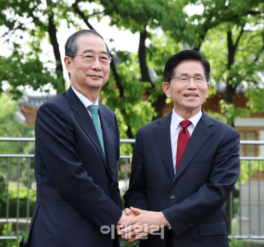 [이데일리 방인권 기자] 김문수 국민의힘 대통령 후보와 한덕수 무소속 대선 예비후보가 8일 서울 여의도 국회 강변서재에서 후보 단일화 관련 공개 회동을 마친 뒤, 악수를 하고 있다.