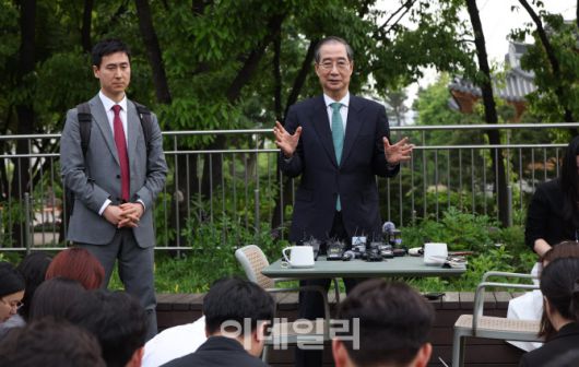 [이데일리 방인권 기자] 한덕수 무소속 대선 예비후보가 8일 서울 여의도 국회 사랑재의 한 카페에서 국민의힘 김문수 대선후보와 후보 단일화 관련 회동을 마친 뒤 취재진 질문에 답하고 있다.