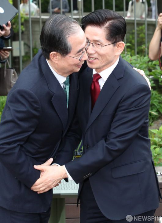 [서울=뉴스핌] 최지환 기자 = 김문수 국민의힘 대선 후보와 한덕수 무소속 대선 예비후보가 8일 국회 사랑재에서 만나 후보 단일화를 위한 2차 회동을 마친 뒤 포옹하고 있다. 2025.05.08 choipix16@newspim.com