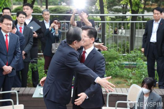 [서울=뉴스핌] 최지환 기자 = 김문수 국민의힘 대선 후보와 한덕수 무소속 대선 예비후보가 8일 국회 사랑재에서 만나 후보 단일화를 위한 2차 회동을 마친 뒤 포옹하고 있다. 2025.05.08 choipix16@newspim.com