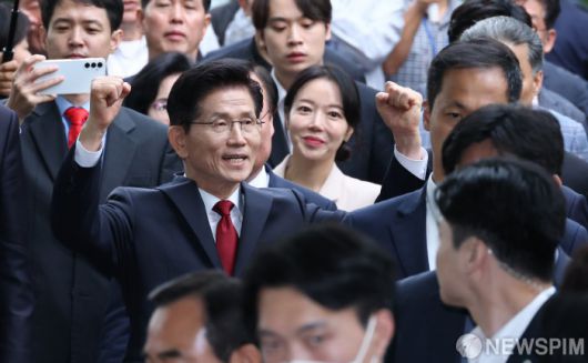 [서울=뉴스핌] 최지환 기자 =김문수 국민의힘 대선후보가 8일 오후 여의도 국회 사랑재에서 열린 한덕수 무소속 예비후보와 단일화 관련 회동을 마치고 지지자들에 연호를 받으며 회동장을 나서고 있다. 2025.05.08 choipix16@newspim.com