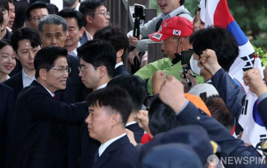 [서울=뉴스핌] 최지환 기자 =김문수 국민의힘 대선후보가 8일 오후 여의도 국회 사랑재에서 열린 한덕수 무소속 예비후보와 단일화 관련 회동을 마치고 지지자들에 연호를 받으며 회동장을 나서고 있다. 2025.05.08 choipix16@newspim.com