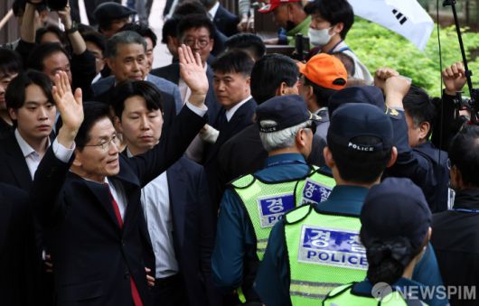 [서울=뉴스핌] 최지환 기자 =김문수 국민의힘 대선후보가 8일 오후 여의도 국회 사랑재에서 열린 한덕수 무소속 예비후보와 단일화 관련 회동을 마치고 지지자들에 연호를 받으며 회동장을 나서고 있다. 2025.05.08 choipix16@newspim.com