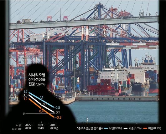 비관 시나리오의 경우 잠재성장률은 2025∼2030년 1.2%, 2031∼2040년 0.4%, 2041∼2050년 -0.3%로 예측됐다. 특히 비관 시나리오에서 잠재성장률이 ‘마이너스’를 기록하는 시점은 2041년 전후로 예측됐다. 낙관 시나리오에서는 2025∼2030년 1.7%, 2031∼2040년 1.1%, 2041∼2050년 0.5%로 각각 전망됐다.