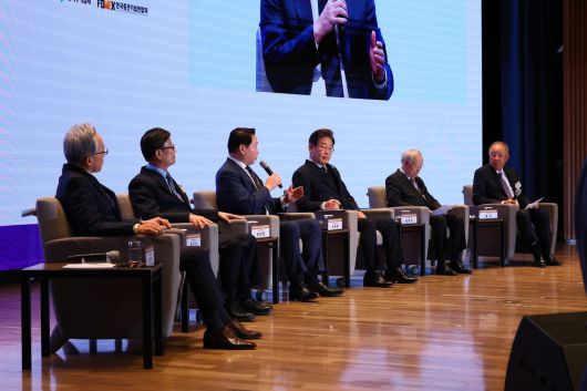 최태원 대한상공회의소 회장이 8일 서울 중구 대한상의에서 열린 이재명 더불어민주당 대선후보 초청 경제5단체 간담회에서 정책 제언을 하고 있다. 왼쪽부터 최진식 한국중견기업연합회장, 윤진식 한국무역협회장, 최 회장, 이 후보, 손경식 한국경영자총협회장, 류진 한국경제인협회장. 연합뉴스 |
