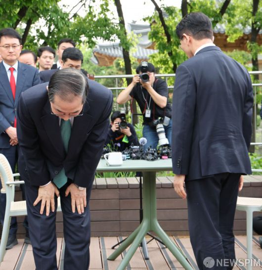 [서울=뉴스핌] 최지환 기자 = 김문수 국민의힘 대통령 후보와 한덕수 무소속 대선 예비후보가 8일 서울 여의도 국회 강변서재에서 후보 단일화 관련 공개 회동을 마치고 인사하고 있다. 2025.05.08 choipix16@newspim.com