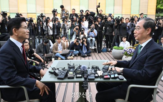 김문수 국민의힘 대선 후보(왼쪽)와 한덕수 한덕수 예비후보가 8일 국회 사랑재에서 후보 단일화 논의를 하고 있다. 박민규 선임기자 |
