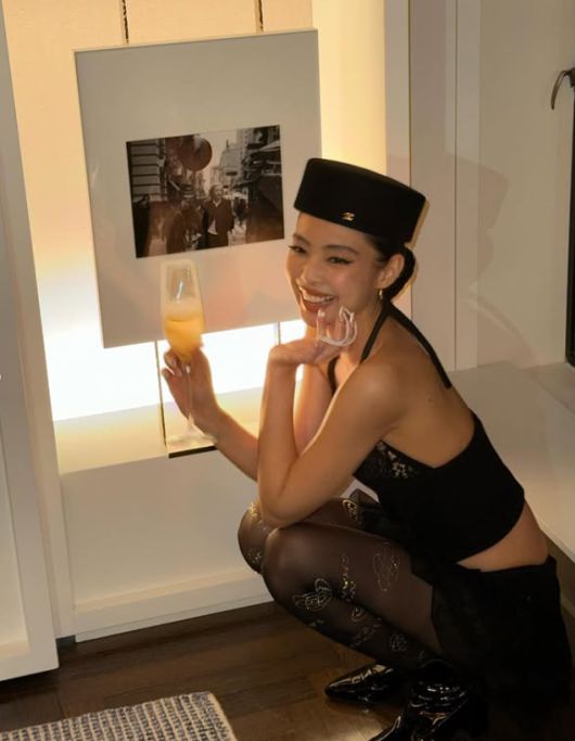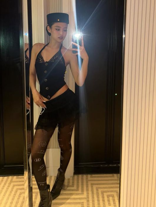 사진 속 제니는 시스루 홀터넥 상의와 미니스커트, 그리고 보터 햇을 착용해 올 블랙 룩을 완성했으며, 반짝이는 샤넬 로고 스타킹이 포인트로 돋보인다. 이와 같은 스타일은 그가 멧 갈라에서 선보인 고급스러운 이미지와도 일맥상통하며 패션계에서 그녀의 독보적인 존재감을 다시 한번 각인시켰다.