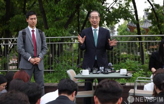 [서울=뉴스핌] 최지환 기자 = 한덕수 무소속 대선 예비후보가 8일 서울 여의도 국회 사랑재의 한 카페에서 김문수 국민의힘 대선후보와 후보 단일화 관련 회동을 마친 뒤 취재진 질문에 답하고 있다. 2025.05.08 choipix16@newspim.com