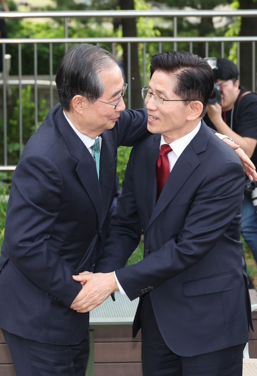 김문수 국민의힘 대선 후보와 한덕수 무소속 대선 후보가 8일 오후 서울 여의도 국회 강변서재에서 후보 단일화 관련 1:1 공개 회동을 마친 후 인사하고 있다. 뉴시스 |