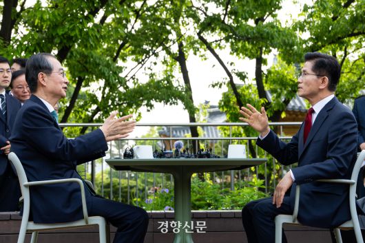김문수 국민의힘 대선 후보와 한덕수 무소속 예비후보가 8일 오후 국회 사랑재 카페에서 공개회동을 하고 있다. 박민규 선임기자 |
