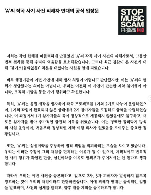 한편 지난해 8일 유재환에게 피해를 입은 23명의 피해자들은 "유재환이 작곡 대금을 받더라도 작곡을 해 줄 의사나 능력이 없었음에도 불구하고, 23명으로부터 총 5500여만 원을 받아챙겼다"며 단체 고소를 진행했지만, 올해 1월 서울강서경찰서는 유재환에 대해 증거 불충분으로 불송치(혐의 없음) 결정을 내렸다.