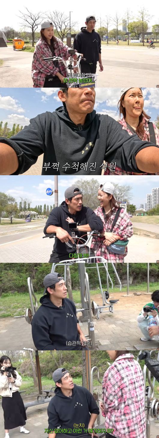 이후 두 사람은 한강 공원에 마련된 운동 기구를 이용하며 시간을 보냈다. 벤치 프레스를 하는 정석원에게 제작진은 "나중에 헬스장에서 한번 보여달라"고 말했고, 이에 정석원은 "저 운동 잘 못해요"라고 겸손한 모습을 보였다. 그러다 이내 백지영의 눈치를 보며 "이런 얘기 하지 말까? 자신없어 하고?"라고 말해 웃음을 자아냈다.