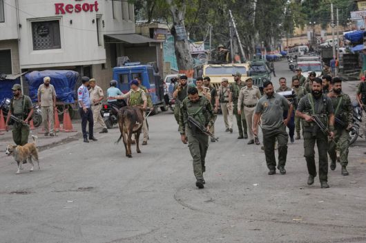인도령 카슈미르 지역의 보안 요원들이 8일(현지시간) 순찰하고 있다./AP연합뉴스 |