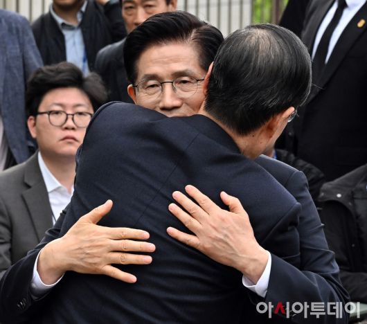 아시아투데이 송의주 기자 = 김문수 국민의힘 대선 후보와 한덕수 무소속 대선 예비후보가 8일 오후 서울 여의도 국회 강변서재에서 후보 단일화 관련 회동을 마친 뒤 포옹하고 있다. ⓒ "젊은 파워, 모바일 넘버원 아시아투데이"