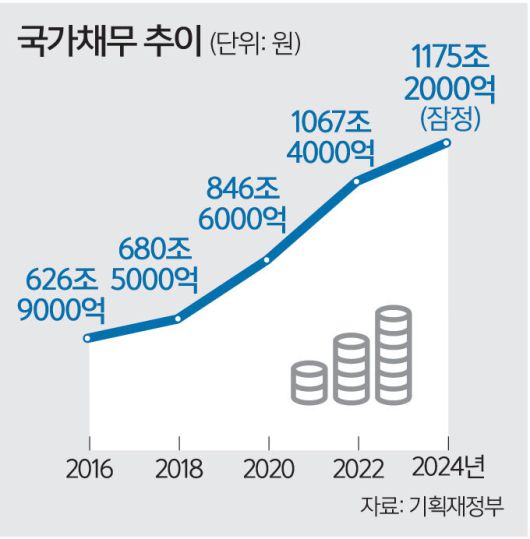 세수결손은 국가 재정 악화로 이어진다. 계획보다 부족한 세수는 국채 발행으로 충당하거나 불용(예산 미집행)으로 상쇄할 수밖에 없어서다. 기획재정부에 따르면 국가채무가 2022년 처음으로 1000조원을 돌파했고 지난해에는 1175조2000억원으로 불어났다. 국민 1인당 2295만원의 빚이 있는 셈이다. 이러한 상황에선 복지 공약도 공(空)약이 될 가능성이 크다.