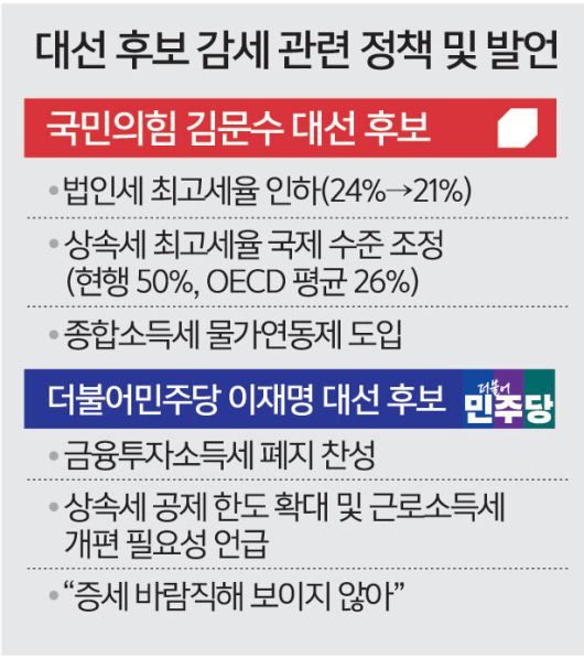 국민의힘 김문수 후보는 ‘중산층의 실질적 세금 부담 경감’이라는 명목으로 감세 공약을 발표했다. 감세는 기업·상속·소득 크게 세 가지 방향으로 나뉜다. 우선 법인세 최고세율을 현행 24%에서 21%로 인하한다는 방침이다. 가업의 계속 운영을 위해 상속세는 자본이득세 방식으로 개편하고, 배우자 간 상속세와 최대 주주 할증(20%)제도 폐지하는 한편 상속세 최고세율(50%)을 경제협력개발기구(OECD) 평균(26%)으로 낮추겠단 구상이다.