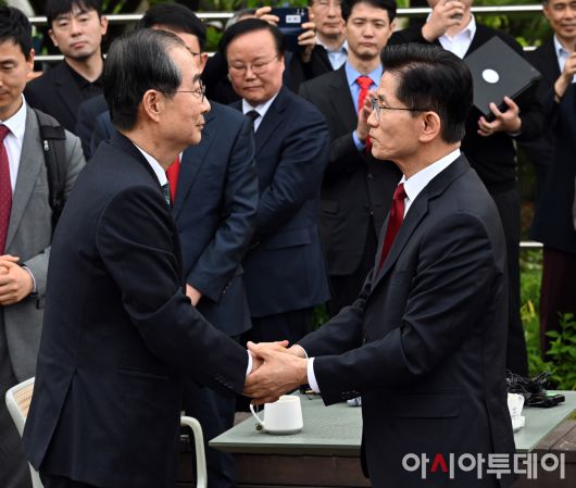 아시아투데이 송의주 기자 = 김문수 국민의힘 대선 후보(오른쪽)와 한덕수 무소속 대선 예비후보가 8일 오후 서울 여의도 국회 강변서재에서 후보 단일화 관련 회동을 마친 뒤 인사를 나누고 있다. ⓒ "젊은 파워, 모바일 넘버원 아시아투데이"