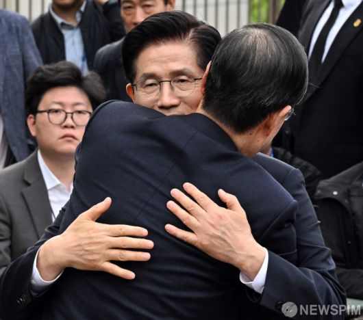 [서울=뉴스핌] 최지환 기자 = 김문수 국민의힘 대선 후보와 한덕수 무소속 대선 예비후보가 8일 국회 사랑재에서 후보 단일화를 위한 2차 회동을 마친 뒤 포옹하고 있다. 2025.05.08 choipix16@newspim.com